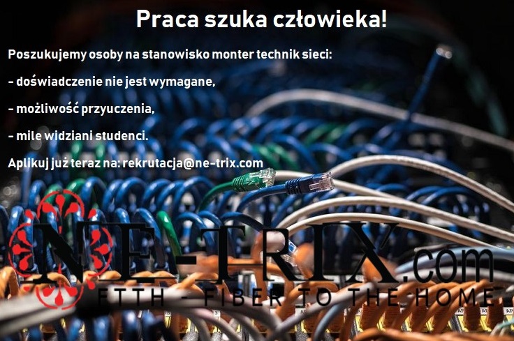 Poszukujemy osoby na stanowisko monter technik sieci: – doświadczenie nie jest wymagane, – możliwość przyuczenia, – mile widziani studenci. Aplikuj już teraz na: rekrutacja@ne-trix.com Prosimy o dopisanie informacji w swoim CV: “Wyrażam zgodę na przetwarzanie moich danych osobowych dla potrzeb niezbędnych dla realizacji procesu rekrutacji (zgodnie z ustawą z dn.29.08.1997 roku o ochronie danych osobowych […]